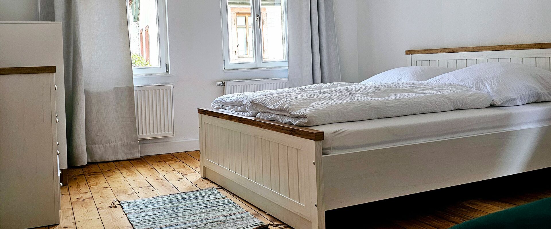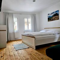 Über eine Treppe gelangt man ins 1.OG. Hier befinden sich zwei getrennte Schlafzimmer. Ein Doppelbett 1,80 x 2,00 Meter und ein Doppelbett 1,60 x 2,00 Meter, sowie eine Schlafcouch als weitere Schlafmöglichkeit, bieten hier Platz für maximal fünf Personen. In beiden Zimmern gibt es ausreichend Stauraum durch Schränke und Regale. Ein Fernseher gehört zur Ausstattung in jedem der Schlafzimmer. Die originalen Dielenböden bringen Behaglichkeit und ein Gespür für die Historie.