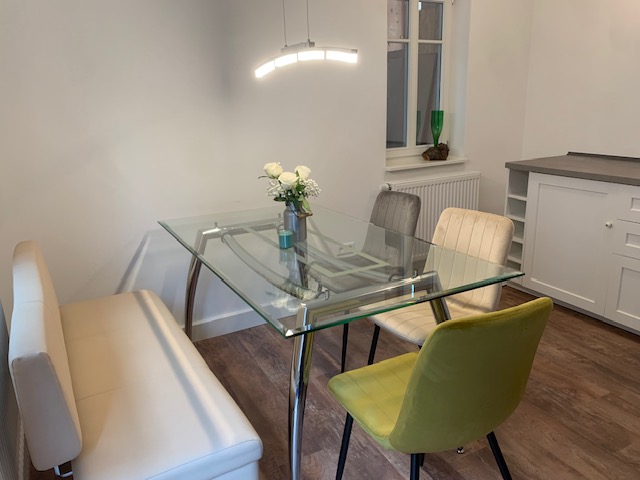 Im Eingangsbereich im EG befindet sich eine kleine Küchenzeile im Landhausstil mit vier Induktionsherdplatten, Kühlschrank mit kleinem Gefrierfach, einer Geschirrspülmaschine, Kaffeepadzubereiter, Wasserkocher und sämtlichem Kücheninventar wie Töpfen, Geschirr etc.. Eine gemütliche Sitzbank, sowie ein Esstisch und drei Stühle laden zum Verweilen ein.