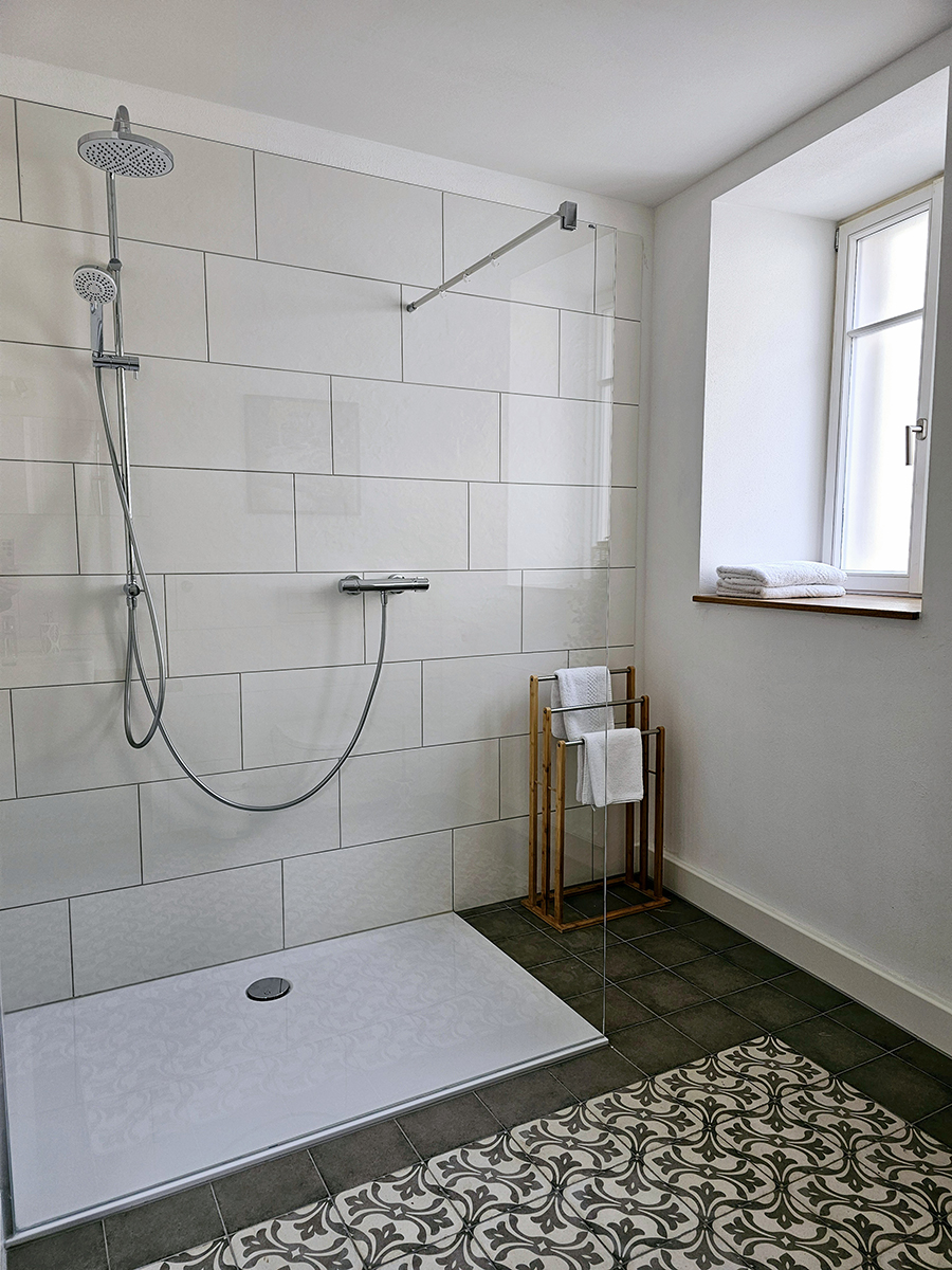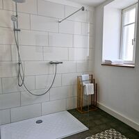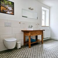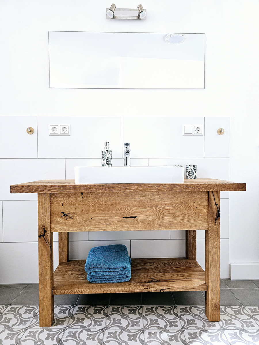 Im vorderen Bereich der Wohnung ist ein großzügiges Badezimmer mit ebenerdiger Dusche, Waschbecken und Toilette. Haarföhn und Handtücher liegen für unsere Gäste selbstverständlich bereit.