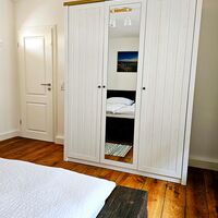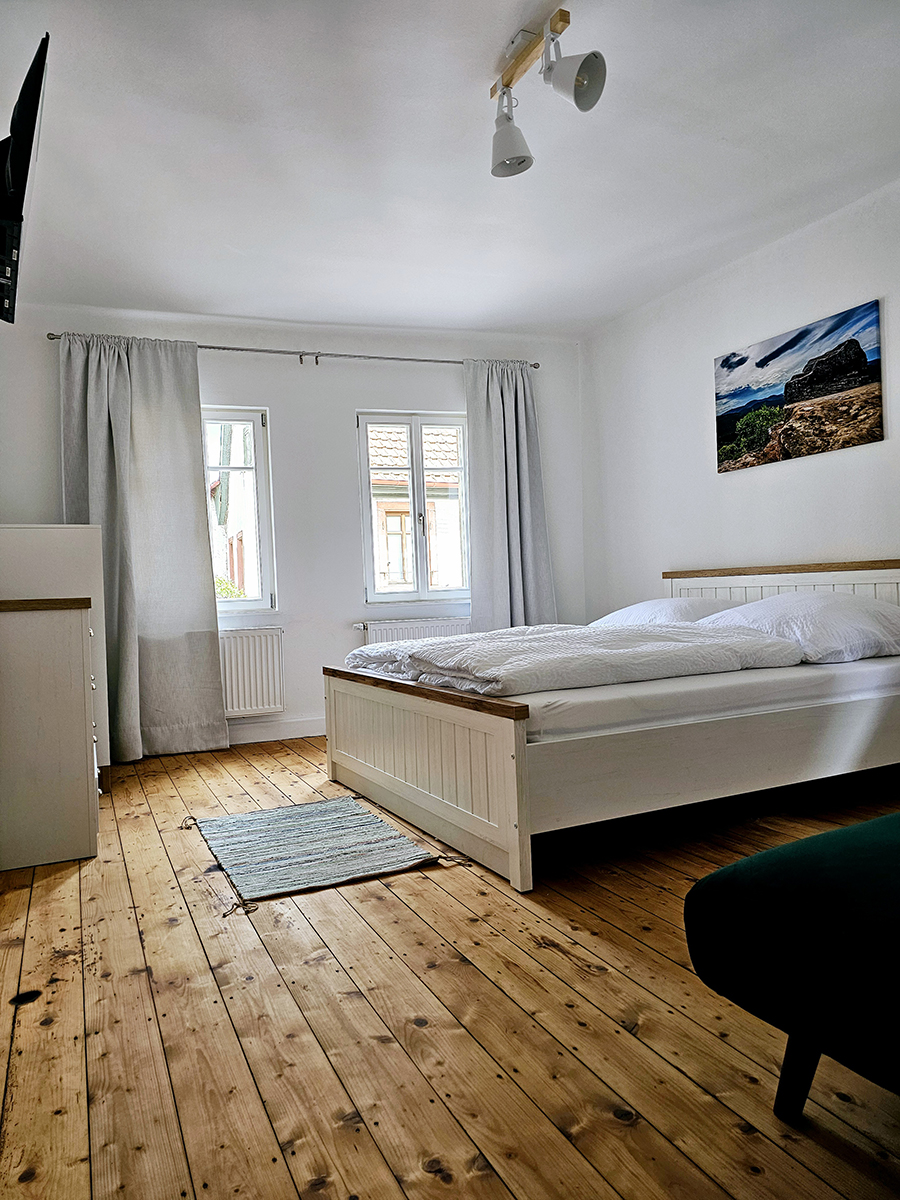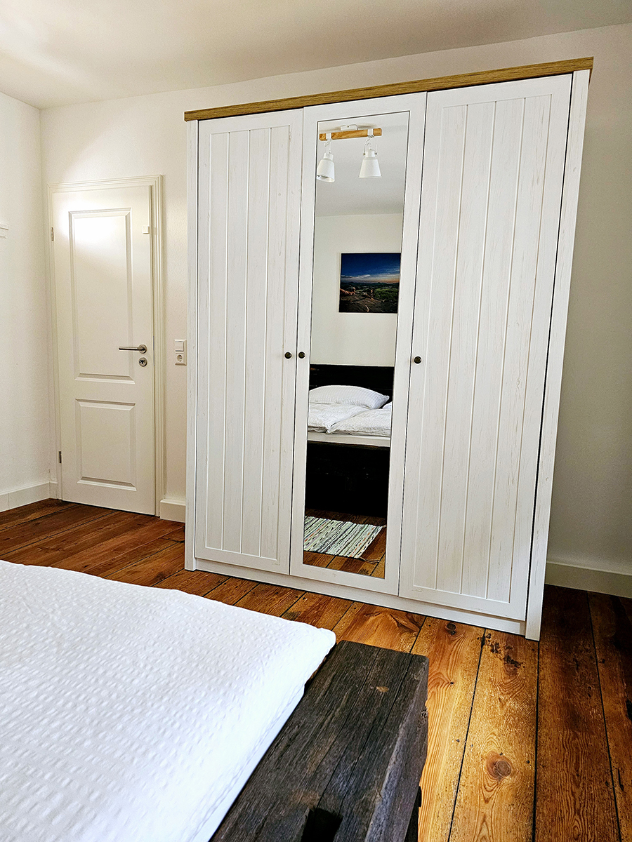 Über eine Treppe gelangt man ins 1.OG. Hier befinden sich zwei getrennte Schlafzimmer. Ein Doppelbett 1,80 x 2,00 Meter und ein Doppelbett 1,60 x 2,00 Meter, sowie eine Schlafcouch als weitere Schlafmöglichkeit, bieten hier Platz für maximal fünf Personen. In beiden Zimmern gibt es ausreichend Stauraum durch Schränke und Regale. Ein Fernseher gehört zur Ausstattung in jedem der Schlafzimmer. Die originalen Dielenböden bringen Behaglichkeit und ein Gespür für die Historie.