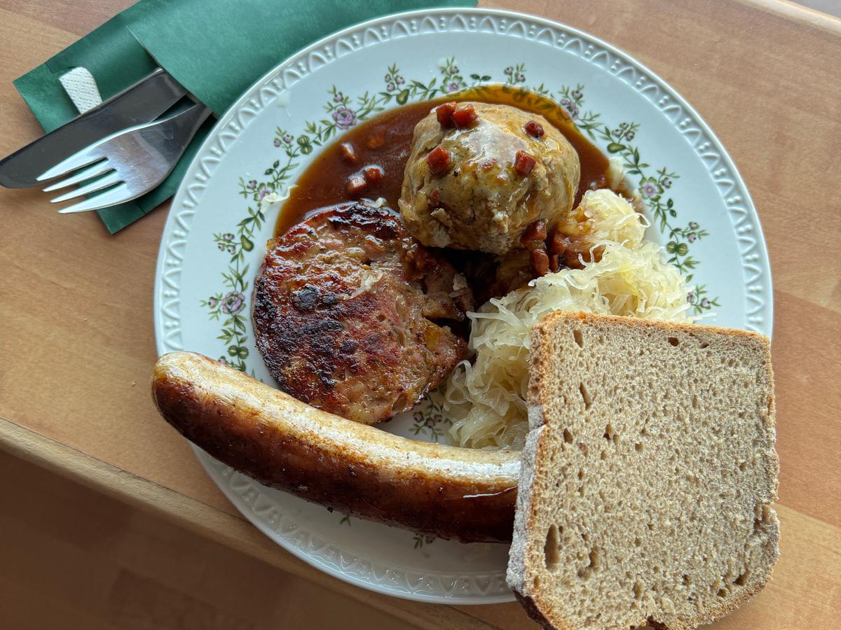 - Saumagenburger mit gerösteten Zwiebeln im Brötchen